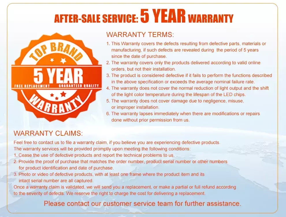 4. A garantia não cobre a redução normal da saída de luz e a mudança da temperatura da cor da luz durante a vida útil dos chips LED.